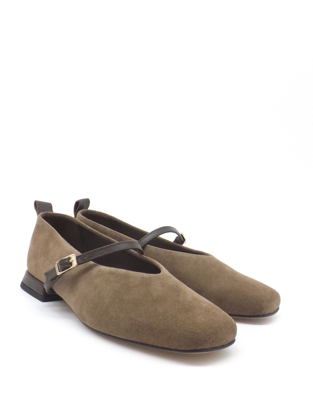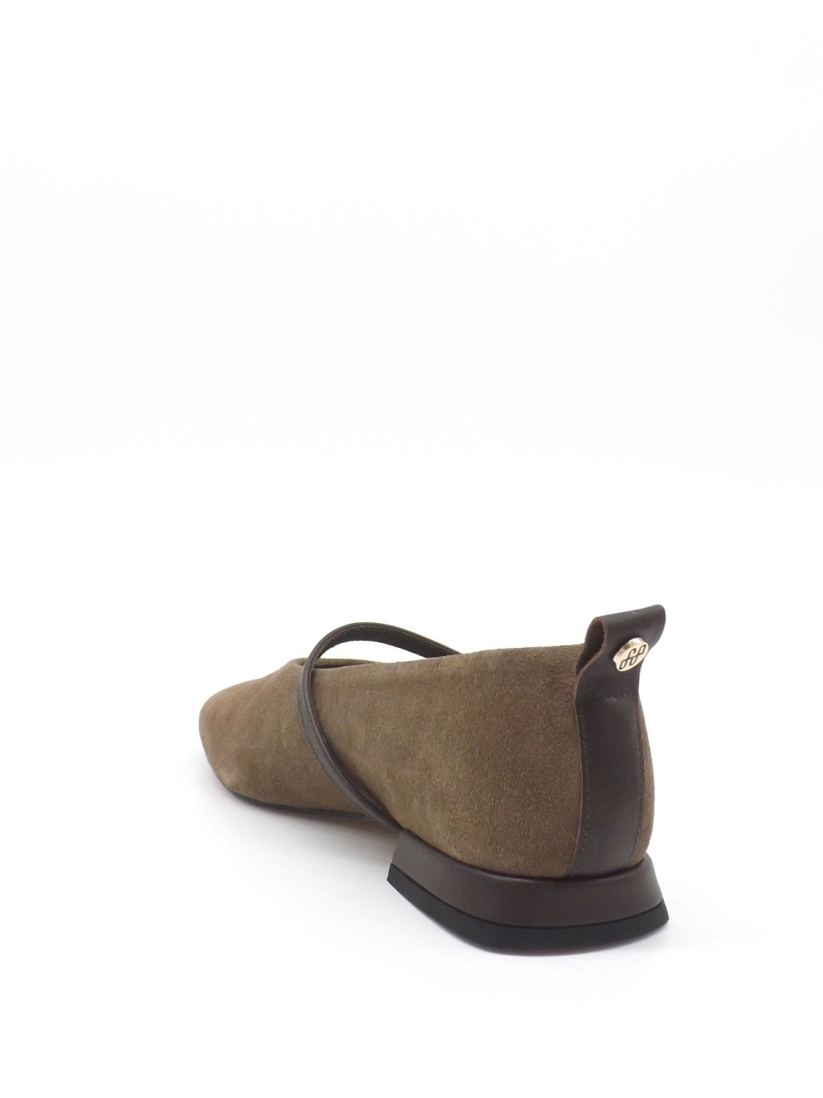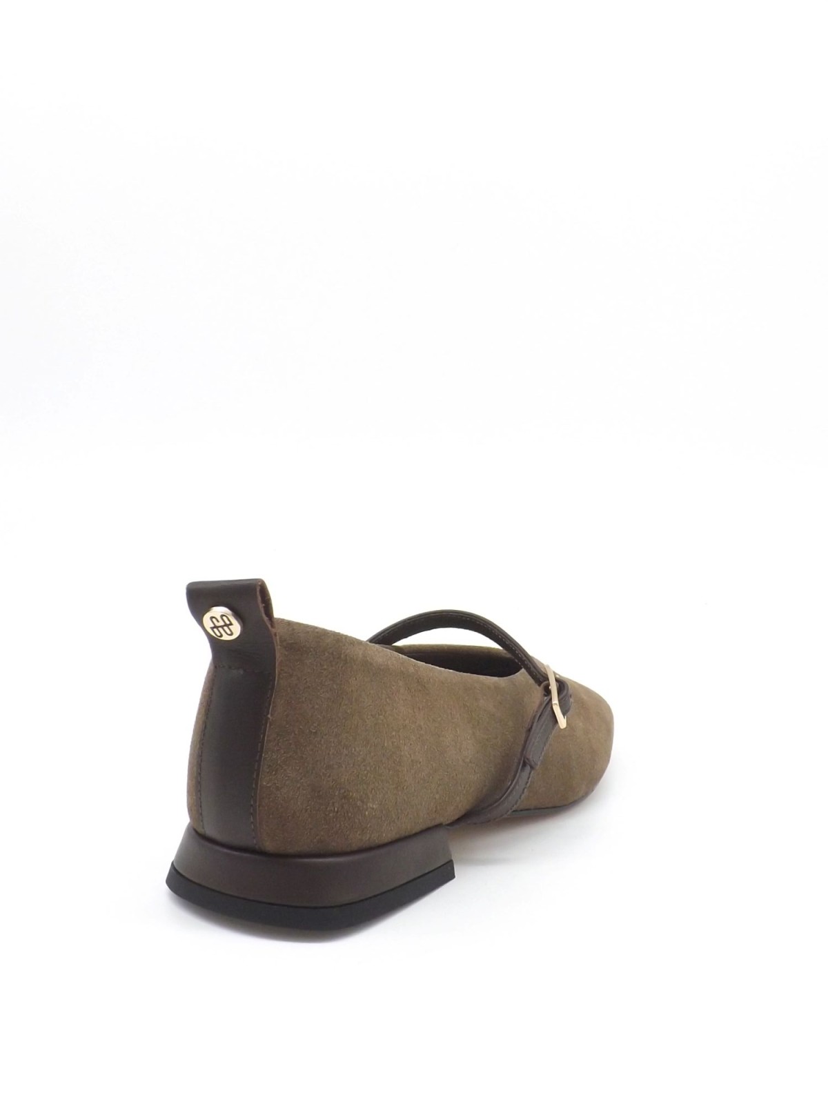 Eleganckie i ponadczasowe baleriny wykonane ze skóry welurowej w odcieniu oliwkowego brązu. Wewnątrz znajduje się skórzana wyściółka w neutralnym odcieniu. Charakterystyczny pasek ze skóry licowej w kolorze ciemnobrązowym zapinany na złotą klamrę nadaje butom subtelnego uroku, a niski obcas w tym samym kolorze gwarantuje wygodę oraz stabilność. Uniwersalny wybór - zarówno do pracy, jak i na co dzień.