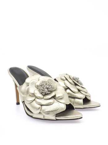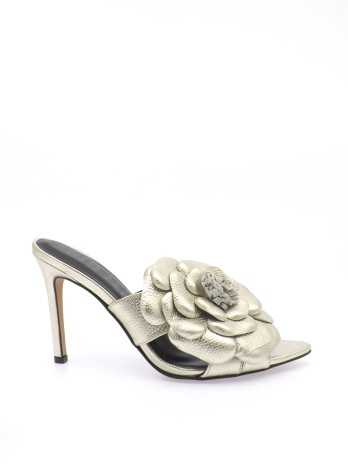 Klapki damskie na szpilce. Cholewka wykonana z złotej skóry licowej, wewnątrz miękka, skórzana wyściółka. Ułożenie pasków w tym modelu sprawia, że klapki doskonale dopasowują się do stopy i zapewniają wysoki komfort podczas codziennego użytkowania. Wygodny fason z ostrym noskiem będzie pasować...