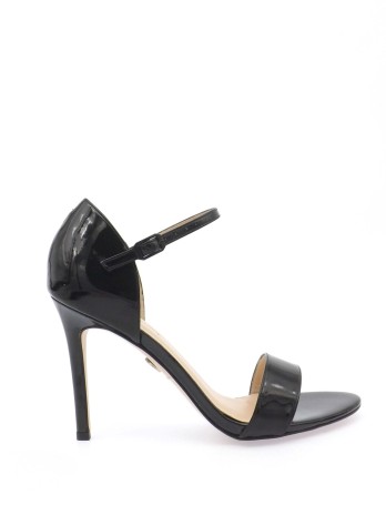 Czarne sandały wykonane ze skóry lakierowanej. Wewnątrz delikatna, skórzana wyściółka w neutralnym odcieniu. Model z zabudowaną piętą i odkrytymi palcami stanowi eleganckie uzupełnienie dla wiosennych i letnich stylizacji koktajlowych. Sandały na wyższej szpilce posiadają subtelny pasek z...