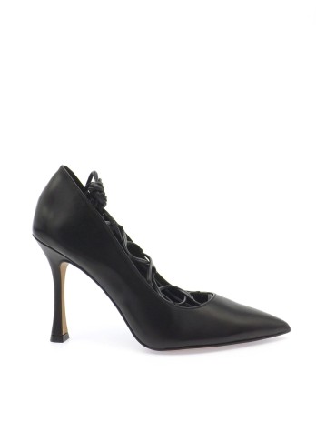 Czarne  czółenka wykonane z  skóry licowej. Wewnątrz delikatna, skórzana wyściółka w kolorze czarnym. Szpiczasty nosek oraz delikatnie poszerzany obcas nadają temu modelowi eleganckiego szyku. Sznurowane czółenka to stylowa propozycja, która sprawdzi się w wielu formalnych i wizytowych...
