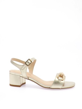 Złote sandały wykonane ze skóry laminowanej. Wewnątrz miękka, skórzana wyściółka w neutralnym odcieniu. Model z  odsłoniętymi palcami to propozycja, która doskonale sprawdzi się zarówno w codziennych, jak i wizytowych sytuacjach. Klasyczne sandały posiadają niewysoki, słupkowy obcas oraz...