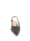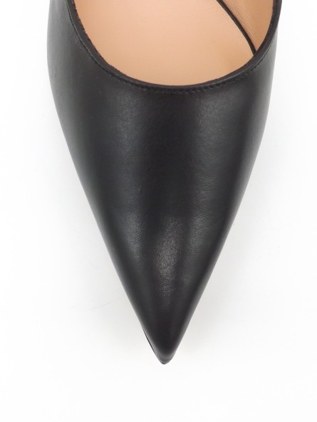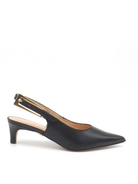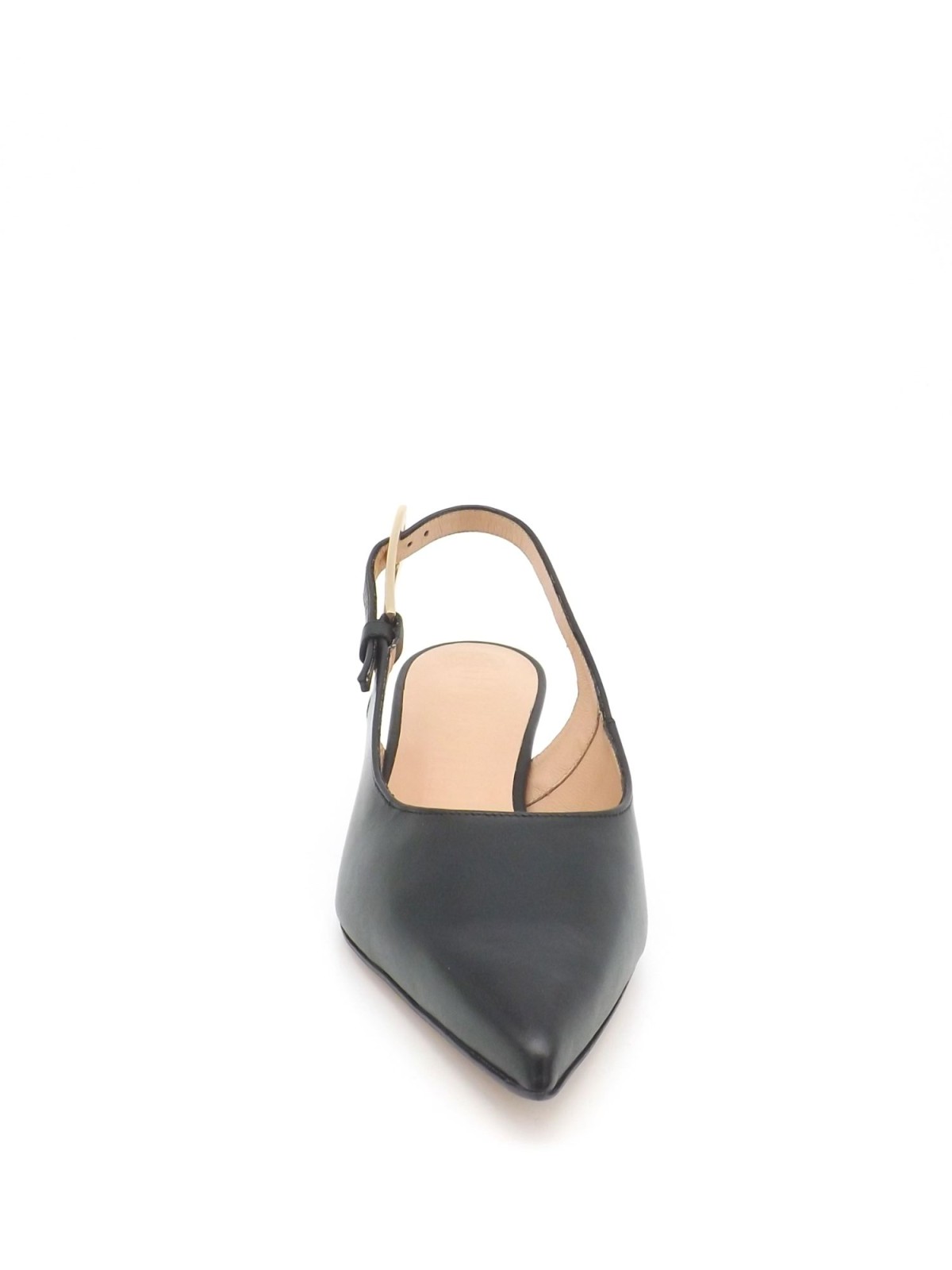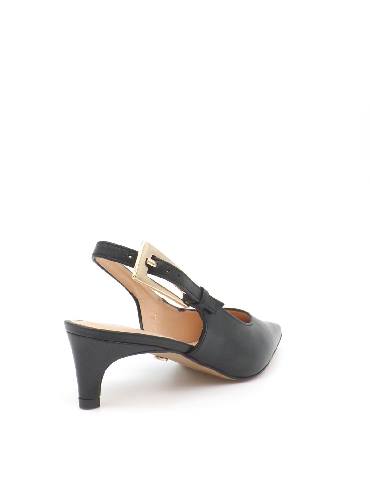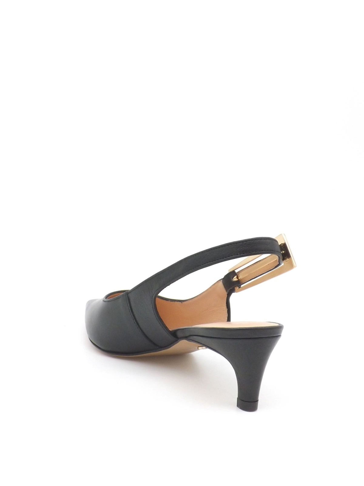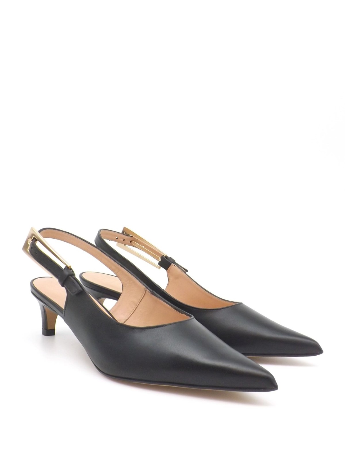 Czółenka ze skóry licowej z odsłoniętą piętą. Wewnątrz delikatna, skórzana wyściółka w neutralnym odcieniu. Model posiada niewysokie, proste obcasy oraz szpiczaste noski, które optycznie wydłużają nogi. Elegancki fason z wygodnym obcasem i okazałą klamrą doskonale uzupełni zestawienia z wizytowymi spodniami oraz koktajlowymi sukienkami. Klasyczne czarne czółenka przyciągają oko designem i zapewniają wysoką wygodę podczas użytkowania.