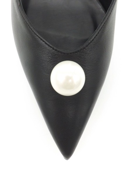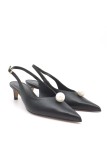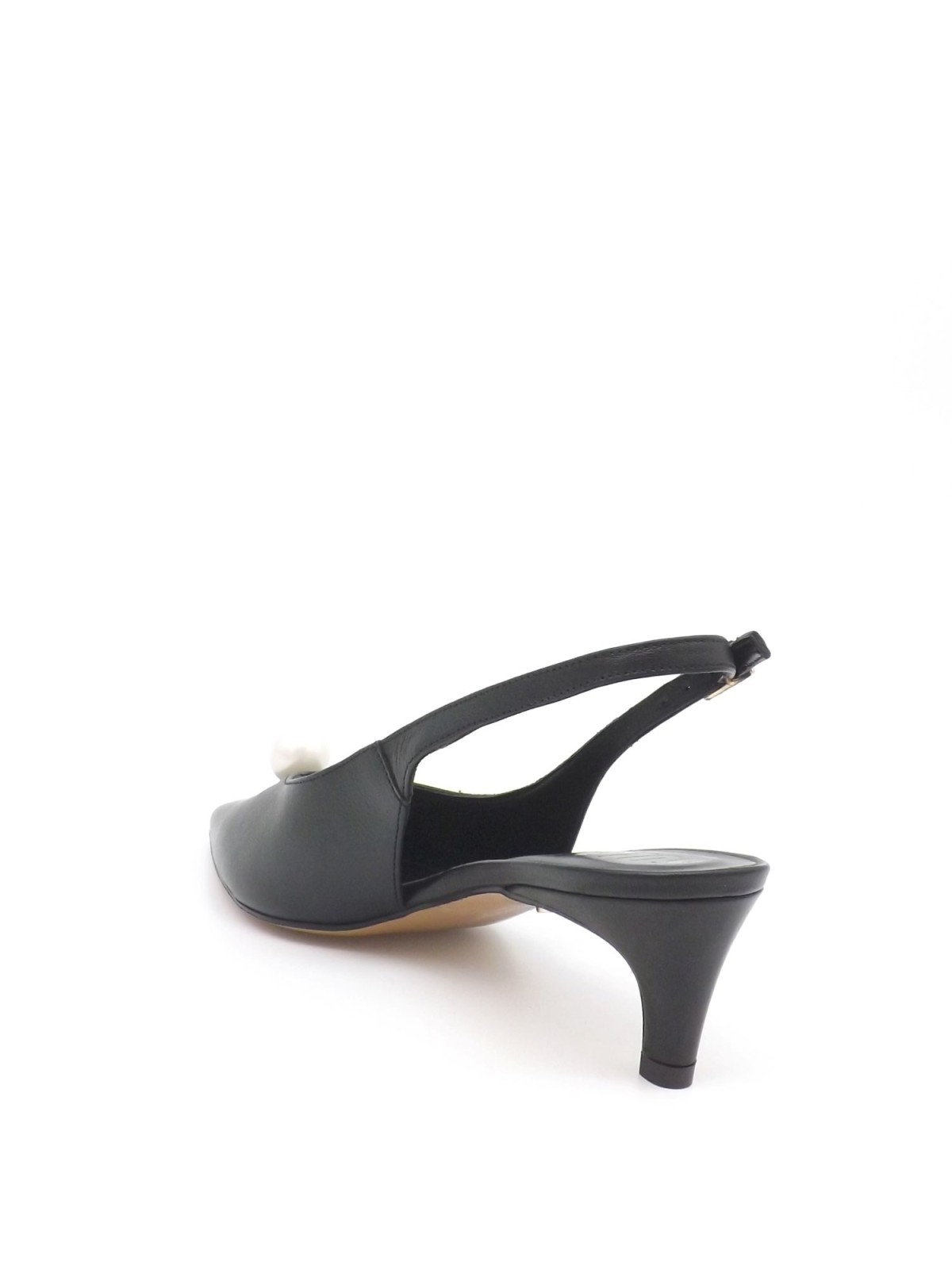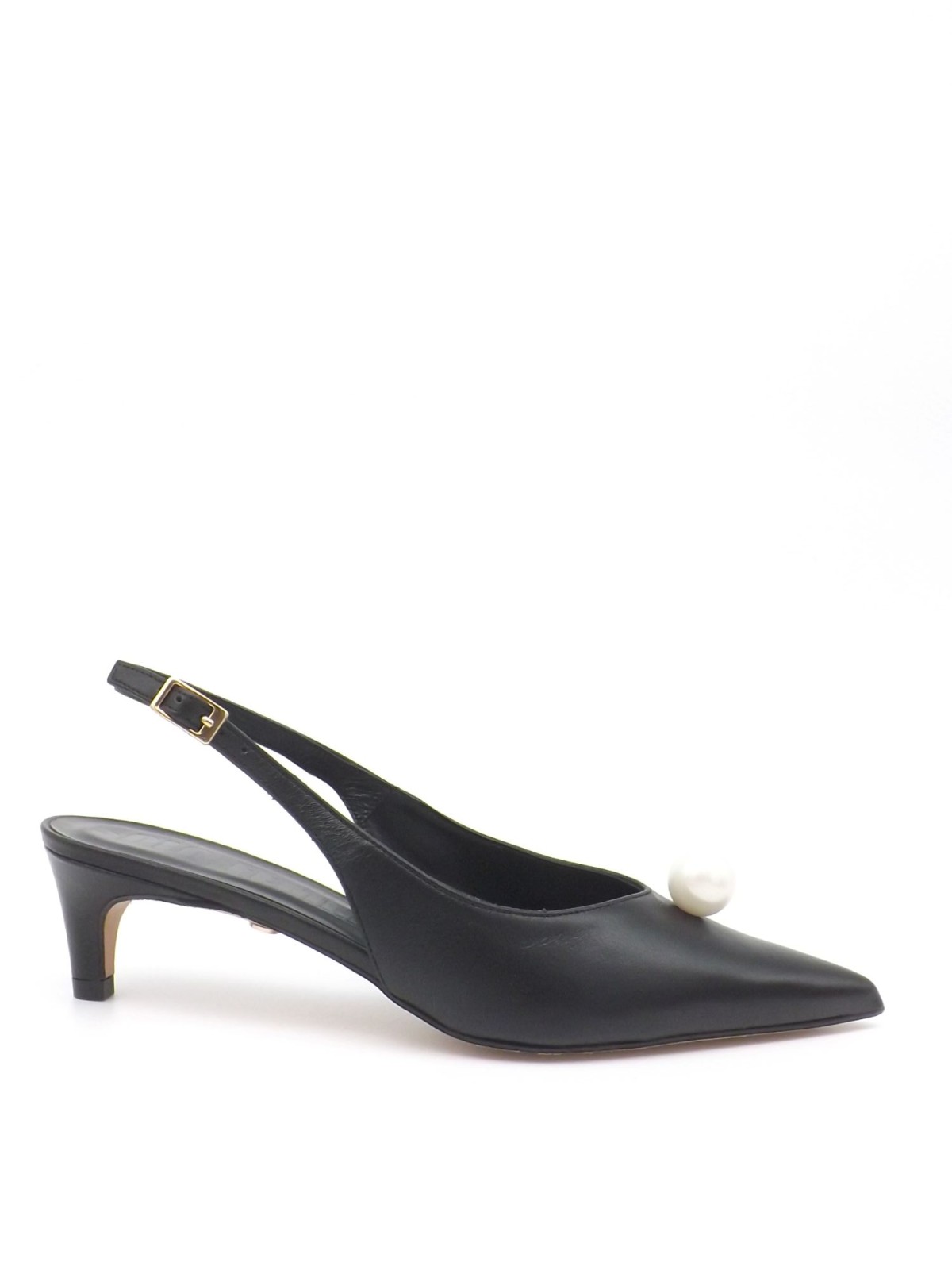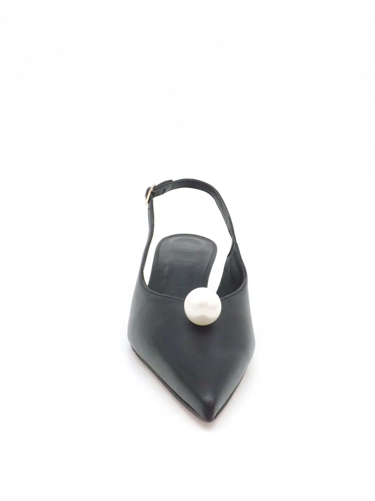 Czółenka ze skóry licowej z odsłoniętą piętą. Wewnątrz delikatna, skórzana wyściółka w neutralnym odcieniu. Model posiada niewysokie, proste obcasy oraz szpiczaste noski, które optycznie wydłużają nogi. Elegancki fason z pojedynczą perłą dodającą wyjątkowego akcentu do stylizacji. Klasyczne czarne czółenka przyciągają oko designem i zapewniają wysoką wygodę podczas użytkowania.