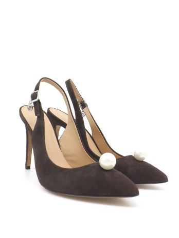 Brązowe czółenka wykonane ze skóry welurowej. Wewnątrz delikatna, skórzana wyściółka oraz wkładki ,,memory" zapewniające komfortowe dopasowanie obuwia do stopy. Model z wyższym, smukłym obcasem oraz delikatnie zwężanymi noskami to elegancki i niezwykle stylowy wybór. Przyciągająca wzrok perła na przodzie dodaje temu fasonowi wyjątkowości. Przy kostce zastosowano regulowane zapięcie z ozdobną zawieszką Solo Femme. Szpilki z odkrytą piętą można dopasować do wizytowej sukienki, koktajlowej spódnicy oraz casualowego, damskiego garnituru. Stylowy fason i efektowne uzupełnienie każdej stylizacji.