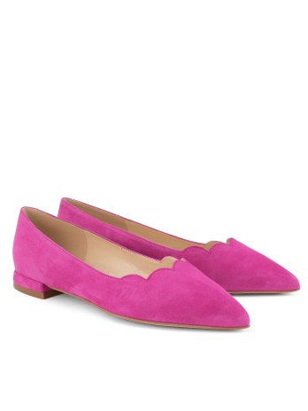 Fuksjowe baleriny wykonane ze skóry welurowej. Wewnątrz delikatna skórzana wyściółka w neutralnym odcieniu. Model z niewysokim obcasem oraz delikatnie zwężanymi noskami prezentuje się niezwykle elegancko. Uroku dodaje mu ozdobny dekolt, który tworzą subtelną falbankę. Zamszowe baleriny można...