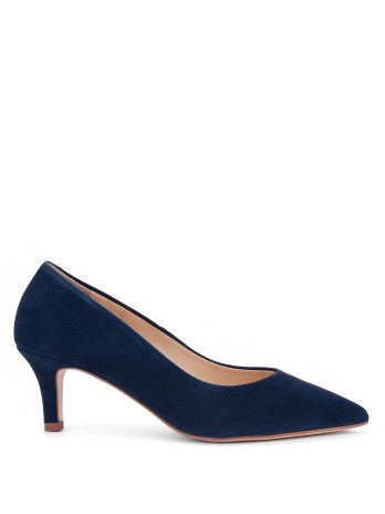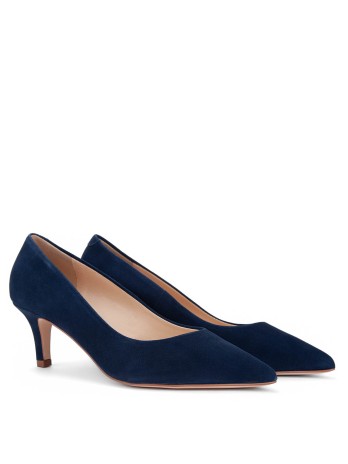 Granatowe czółenka wykonane ze skóry welurowej. Model na niewysokim, zgrabnym obcasie jest elegancką i uniwersalną propozycją, którą można dopasować do wielu różnych zestawów. Wewnątrz zastosowano skórzaną wyściółkę w neutralnym odcieniu. Eleganckie szpilki z wygodnie wyprofilowaną cholewką można...